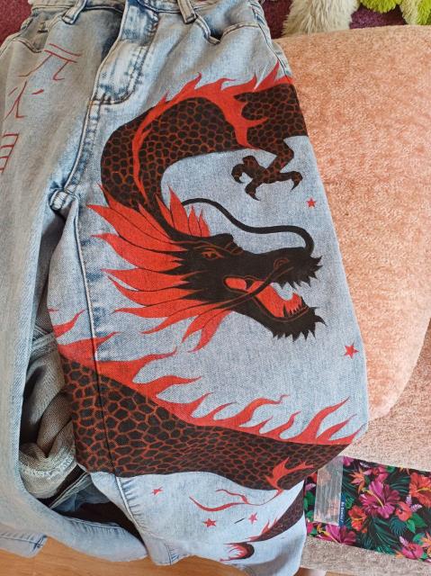 Моя рукодельница сильно в учебе, сделала только дракона на джинсах для дочки MyFarm, она в воскресной теме показывала.