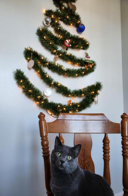 Я теоретик, кот был на удивление равнодушен к елке. Но на днях на озоне видела настенную елку из фетра. Мне неактуально, но идея запомнилась. Вместо мишуры можно тесьму\ленту блестящую, я когда-то бантики на венки из нее делала