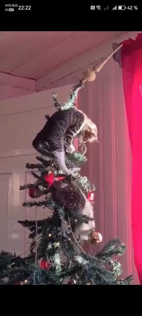 Но наши коты никогда не пытались свалить елку. Максимум - покачать низко висящий шарик лапой....