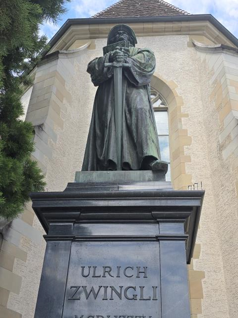 Недалеко от собора находится памятник реформатору церкви Ульриху Цвингли. Он, как и Кальвин, призвал отказаться от роскошного убранства и обрядов католических церквей и всё сильно упростить). В настоящее время реформатская церковь (одно из направлений протестанства, которого придеживается примерно 21-23% населения Швейцарии) представляет собой очень скромное помещение без каких либо элементов декора. Священник не носит облачения, проповедь читает в обычной цивильной одежде.