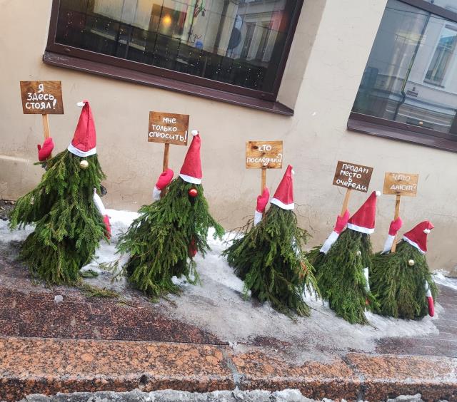 Удивляет Москва, весной все еще украшенная елками повсеместно!