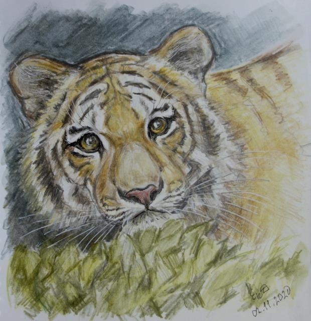 И как бы вопреки нарисовала тигра, которому повезло в жизни. Она вот в этот самый год Тигра родилась, а зайцы ей не интересны пока даже в гастрономическом плане.