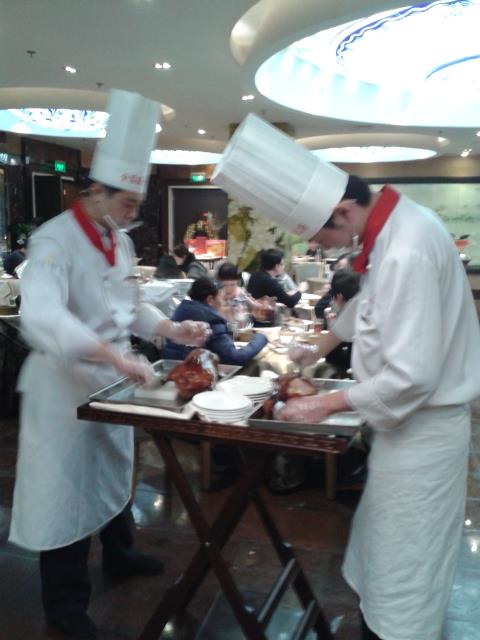 Ну в Пекине нам ее вообще целиком принесли и прямо рядом с нашим столом нарезали и нам подали, так что никаких отсутствующих частей быта не могло. Фото так себе по качеству, но тушки видны.