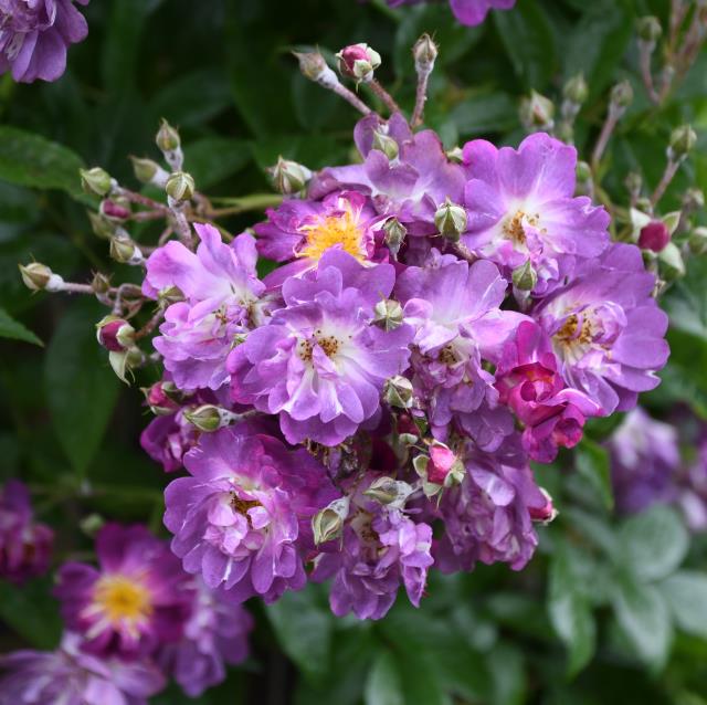 У нас в ботанической саду есть роза почти фиолетовая(однажды застала её цветение), но она не кустовая, цветки крупные. Сорт тоже не знаю.