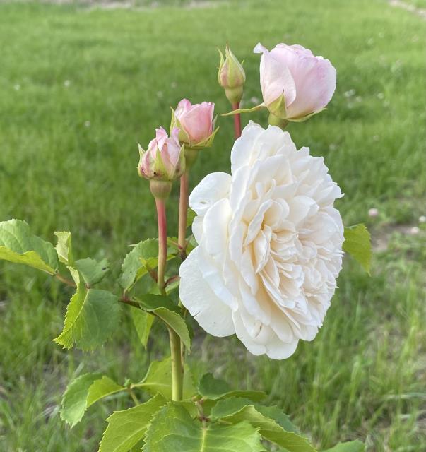А вчера попался куст крупных мохровых бордовых роз и в нём же росла ветка с бледно-розовыми мелкими обычными цветками, как у шиповника.