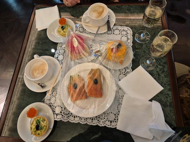 Возвращаясь к театру, хочется отметить костюмы Инны Чуриковой и Юлии Борисовой. Бесподобные платья можно увидеть в фойе театра. Сама постановка очень яркая, юмористическая. Аронова блистала, ее фразы остались в памяти и вызываои в зале гомерический хохот. Спектакль шел с двумя антрактами, около 4-х часов. Как сказала актриса "накажи меня, Господи - чтобы я всю жизнь играла такие долгие спектакли!" Мы, хотя и были после работы, не заметили этих 4-х часов. Тому способствовал и накрытый столик в театральном кафе, который заказали и оплатили те же родители. Мы пришли в антракте, а нас ждала уже накрытая полянка.