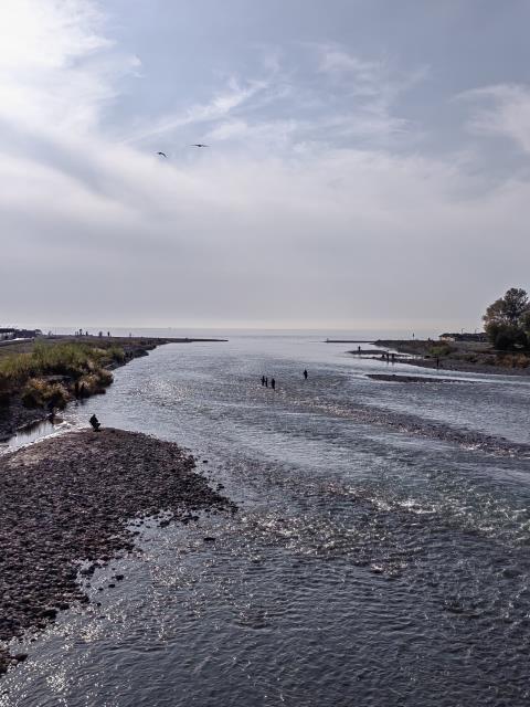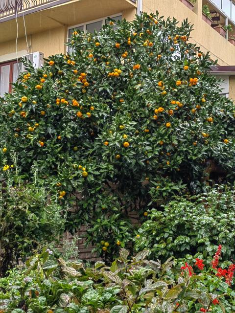 Немного фоточек из прекрасного морского и солнечного далека. На второй фотографии человечки в реке это рыбаки, пошла форель и мужички сильно возбудились. Немного забавно выглядит новогодняя витрина на фоне самокатов и зелёных кустарников, жаль пальмы не попали в кадр)