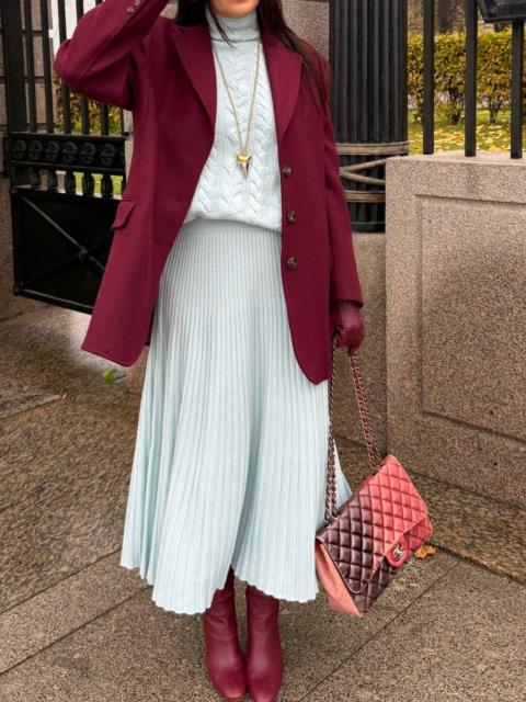 Перелистывая воспоминания своего гардероба вижу, что всё это я носила, даже вязанная узкая юбка у меня была именно такого цвета, но в виде платья. И талия была как у модели под кожанным ремнем. Но особенно радовали времена мини юбок и с трудом натягиваемых Левис Страус. Сегодня этими подолами уже не удивить, да и ходить удобнее в брюках, если нет шофера.