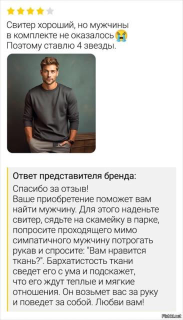 Так она себе покупала мужика в свитере. Потому и 4 звезды, что мужчину не додали))) Был бы комплект, поставила бы 5 звёзд.