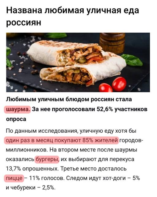 Говорят шаурма любимая уличная еда у россиян, Флора кажется любит шаурму. Я склоняюсь к макдаку, макавто обычно использовали.. Т.е. для меня бургеры.