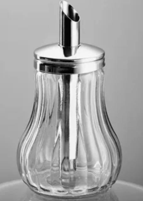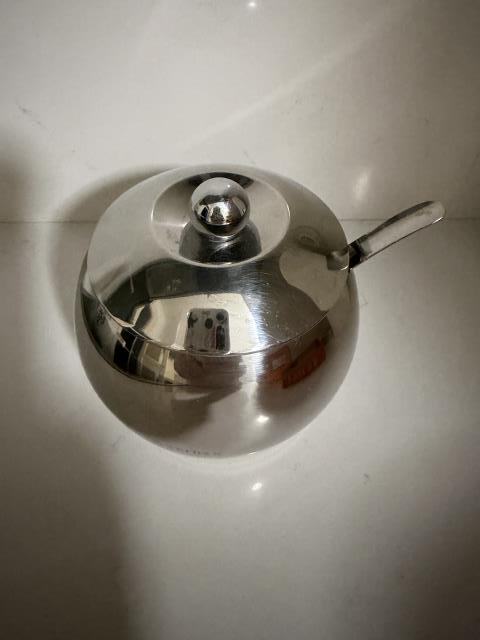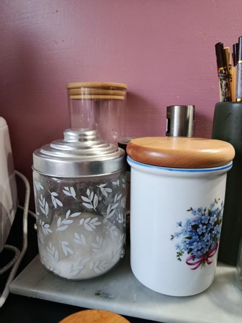 На стол сахарницу не ставим, у нас только дочь по утрам сладкий чай пьет. Поэтому стоит в большой банке у плиты-чайника-кофемашины. На случай гостей-сладкоежек купила маленькую фарфоровую, но она быстро стала солонкой)