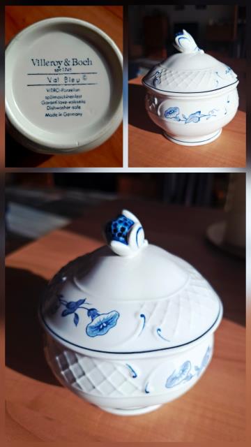 Сахарницами не пользуюсь. Но давно-давно, когда еще пользовалась мне друзья дарили такую штучку для сахара и соли. Пользовалась только нижним отделением для сахара, для соли лежала в шкафу. Деревяшка за годы использования поистерлась и выцвела, была более синяя. И, та-дам, после фото я разбила верхнюю часть для соли.