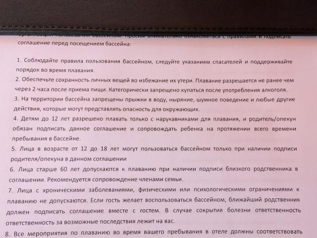 Муж каждый раз расписывался за полотенца в Китае. И один раз решил почитать, что в бумажке. А оказалось, что люди старше 60 должны купаться в бассейне только с письменного согласия родственников и под их присмотром:) Естественно, ржала весь оставшийся отпуск над ним, что разрешения не даю:) Бассейны глубиной были по метру, наверное:)