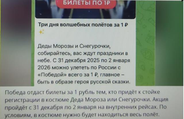 Находясь в костюме Деда Мороза (мужчины) или Снегурочки (женщины), сообщить представителю авиакомпании, что хотите совершить перелёт за 1 рубль на выбранном рейсе;