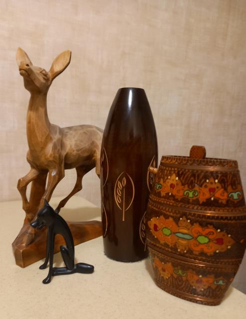 От бабушки, годов 60-70-х. В деревянную вазу сухой букет можно ставить. Зачем бочонок, не знаю. Видимо, это все подарки-сувениры.