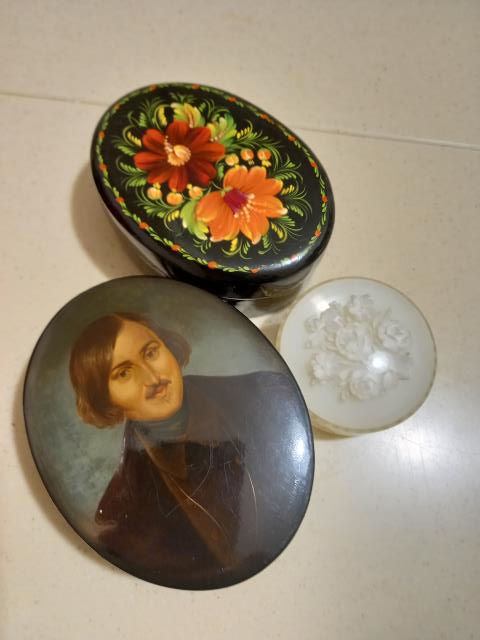Две шкатулки и бывшая пудреница. Шкатулку с Гоголем мой отец дарил своей маме.