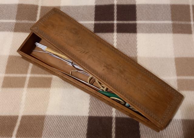 И еще, последнее от меня сегодня. Шкатулка для рукоделия. Бабушка ей пользовалась по назначению, я только собираюсь когда-нибудь узнать, возможно ли реставрировать.