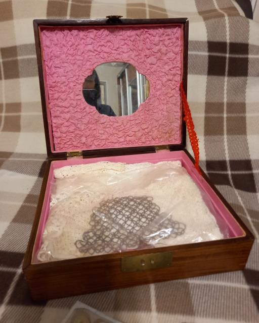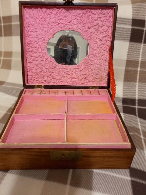 Шелк истерся, зеркало в пятнах. Стыки короба разошлись, держится это все только с закрытой крышкой. Память оставить хочется, использовать уже не получается.