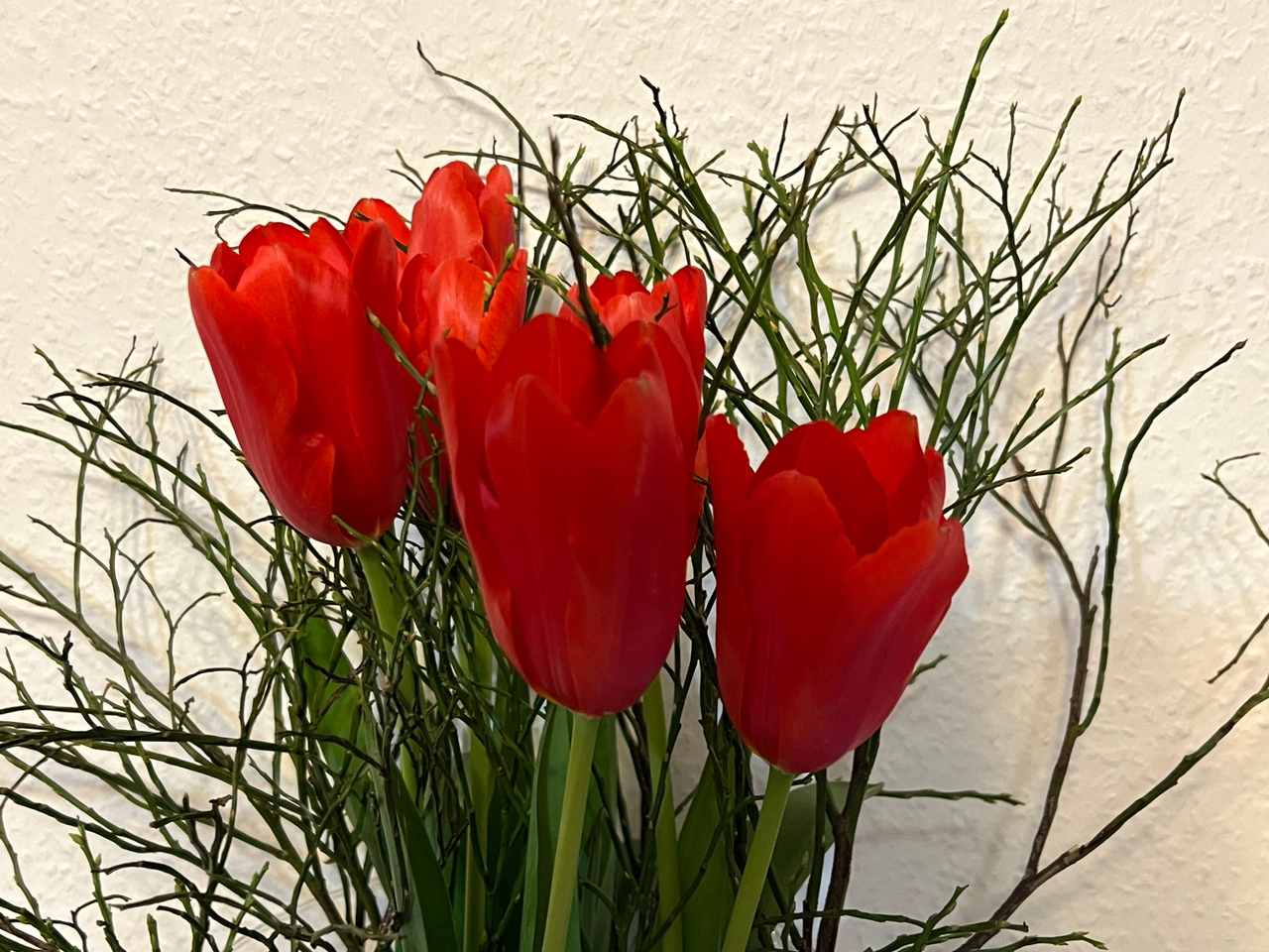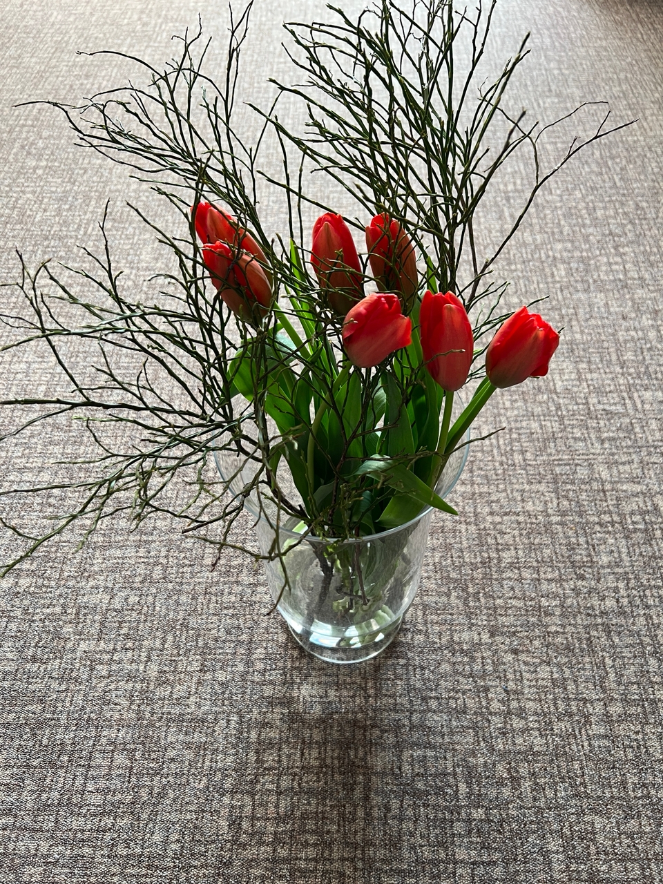 Во вторник у меня был ДР. Муж пошёл за букетом(обычно дарит огромные красные розы), в этот раз вернулся с тюльпанами. Я таких не видела раньше - почти пол метра высотой