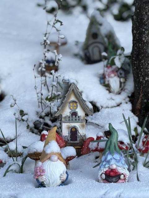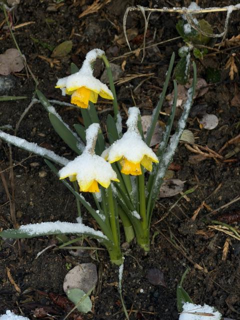 У нас третий день снег валит. Пока красиво для разнообразия. Все нарциссы под снегом кроме тех что под елкой спрятались.