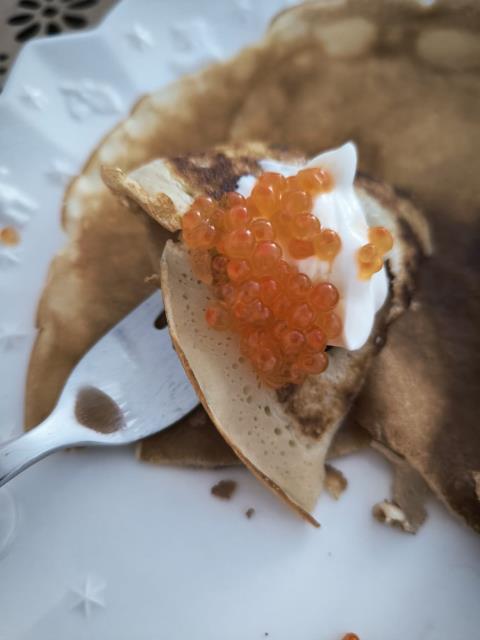 Блины не люблю, но наша бабушка где-то купила очень вкусные с семгой, свернутые трубочкой, я аж два сразу с кофе умяла))