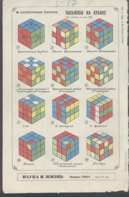 Кубик жив до сих пор, только сейчас прочитала, что можно было его разбирать и переклеивать цвет. Помню, что папа пришел с работы и принёс 2 кубика, каждый стоил 5 рублей. Мне было лет 10-11, училась сама, собирала 2 яруса. После массовой продажи кубиков журнал Наука и Жизнь опубликовал схему, по которой можно было его собрать, по схеме собирала последний ярус, сейчас вряд ли вспомню.