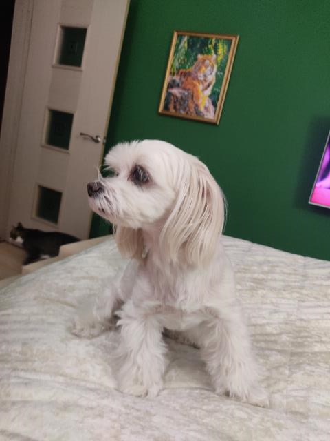 Мальтийская болонка. Бычит на больших собак. Воображает себя хозяином двора:) Трусливый, но наглый:)