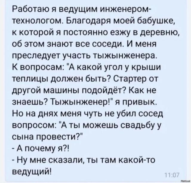 Про инженера понравилось. Народ считает если врач( онколог) он травматолог, лор, кардиолог и ветеринар .