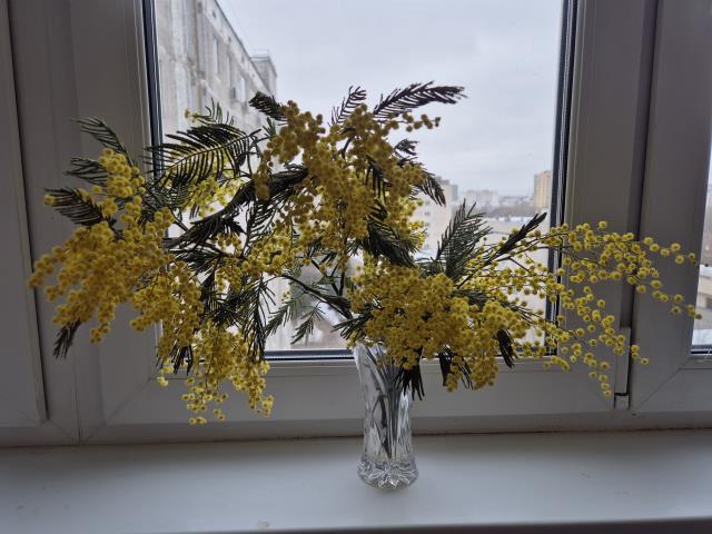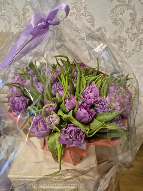 Букет пока скромный. Муж обычно дарит чётко день в день. Это сама купила) Ходила за продуктами, а в пятерке тюльпановые поля по дешевке, не смогла пройти мимо.