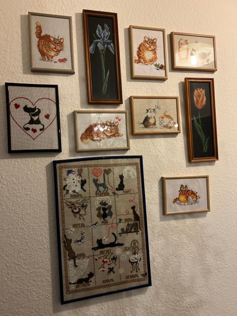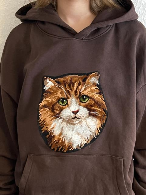 Ещё вышила кота, пришили его на толстовку для дочки. Одноклассники оценили)