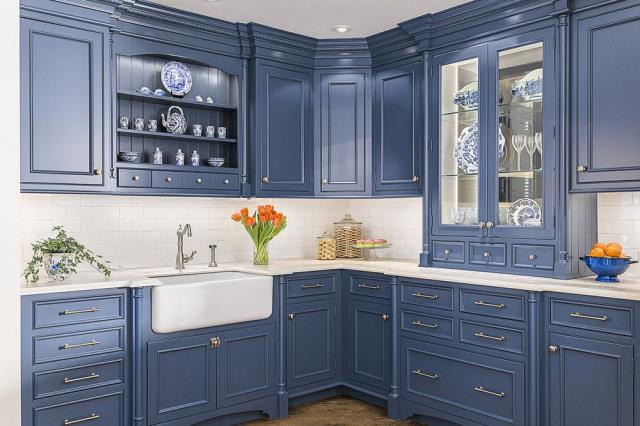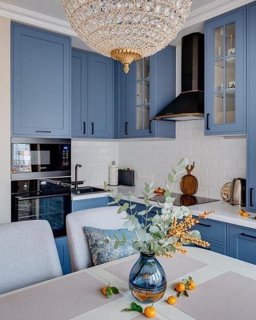 Светло-серая столешница, интенсивно-синие фасады. Голубенькая плиточка.