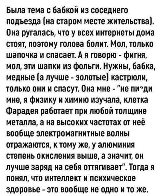Я читала недавно историю, про то, что такая бабка в подъезде всем режет интернет- кабели. Сотрудники туда уже отказываются ездить. Сделать с ней вроде как ничего нельзя 03.04.2026 09:17:19, хухра-мухра