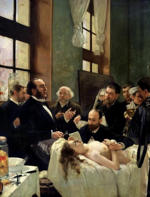 Центральное действующее лицо композиции – статный мужчина с пышными бакенбардами, неторопливо объясняющий суть и тонкости предстоящего процесса. Это всемирно известный хирург Жюль Эмиль Пеан, изобретатель кровоостанавливающего зажима и искусственного плечевого сустава. Долгие годы он возглавлял хирургическое отделение парижского госпиталя Сен-Луи. Доктор не разделял преподавание с практикой, поэтому на проводимых им операциях всегда присутствовало большое количество перенимающих опыт молодых коллег.