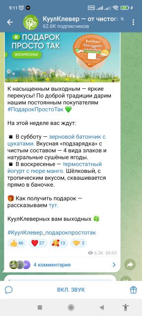 В Мяснове каждые выходные подарок просто так, только его надо в приложении активировать, если мимо иду, заберу. Фудсити еженедельно дарит ящик чего-то, розыгрыш проводит, ящик киви выиграла.