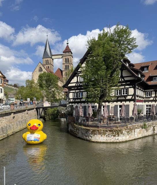 Эта же церковь снаружи, а по реке плавает утка, приглашающая на городской весенний праздник