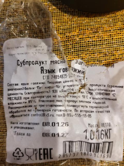 Заехали в Пятерочку, прохожу мимо заморозки, вдруг вижу ценник "Язык говяжий" и цена 512 руб за кг. Вместо 1200. Но языка не было:) Заехали в другую Пятерочку рядом, там надо было купить другой товар (у нас не во всех одинаковый ассортимент). Заодно смотрю заморозку. Язык говяжий, цена 380 руб. за кг вместо 1200. И опять языка нет. Но тут мне стало интересно и мы уже прицельно поехали домой другим путем, там тоже есть Пятерка. И по цене 512 руб. один язык был! Я его купила.