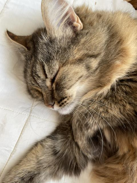 Моя Масяня, подобранная на дачной помойке в прямом смысле слова. Ей было несколько дней, уже почти умирала, кто то выбросил. Я подобрала, кормила из тряпочки и пипетки, она даже соску сосать не могла. Люблюнимагу.
