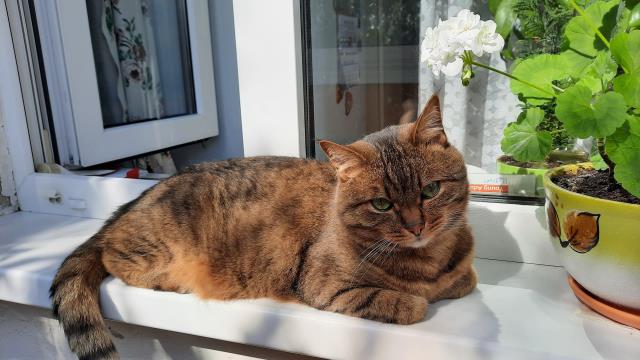Кошка Тигра. Пыталась разбудить, чтобы сфотографировать) Прибилась на даче летом в один год. Муж приехал детей забирать и она в машину прыгнула, так и приехала с ними))