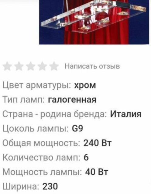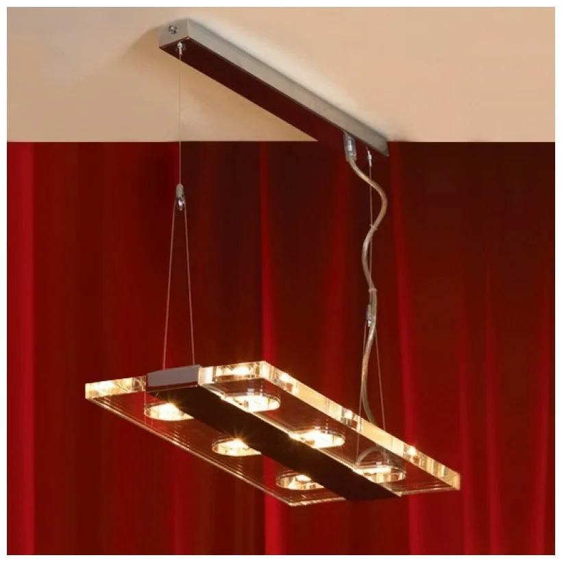 Новая стильная подвесная люстра хрустальная отличного итальянского качества. Хромированный металл и прозрачный хрусталь прессованный (штампованный). Мощность: 6 ламп Х 40W G9 (галогеновые или светодиодные). Размеры: 46см Х 23см, высота от потолка регулируется до 115см. Крепление на планку.