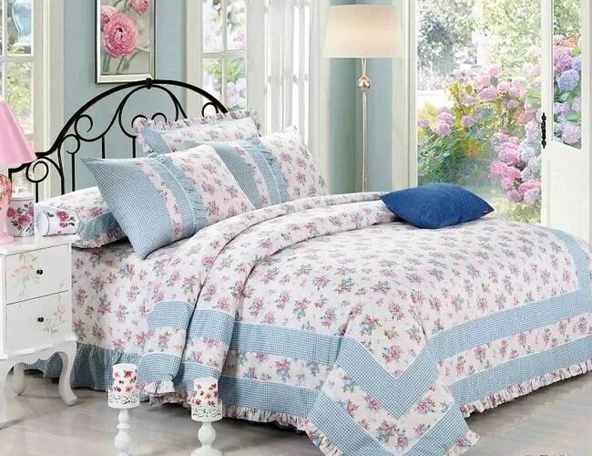 Я сейчас поищу свои фото, у меня конечно всё эконом-вариант - и белье, и мебель, просто посмотрите по цветовому сочетанию именно с такими голубыми стенами. Очень спокойных тонов должен быть текстиль, кмк.