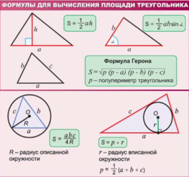 Вот для примера что я выкладываю перед ребенком если надо подсчитать площадь треугольника, если он затрудняется записать нужную формулу сам. Все мои ученики знают, что есть пять вариантов которые надо применять в зависимости от конкретных условий. И постепенно запоминают все формулы и могут их вывести. Обычные школьники на первых уроках в лучшем случае вспоминают одну, а иногда и вовсе ни одной не помнят.