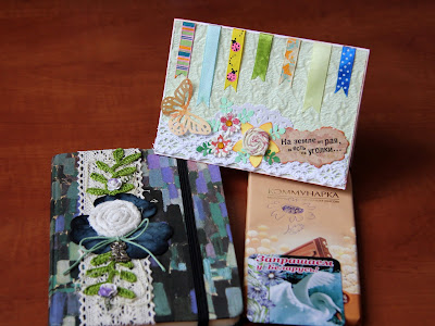 А в придачу я получила ещё 3 замечательных рукодельных подарка - блокнот, закладку и красивую открытку. Жанна, твои пожелания я вклеила в открытку, ведь ты мне её прислала :)))