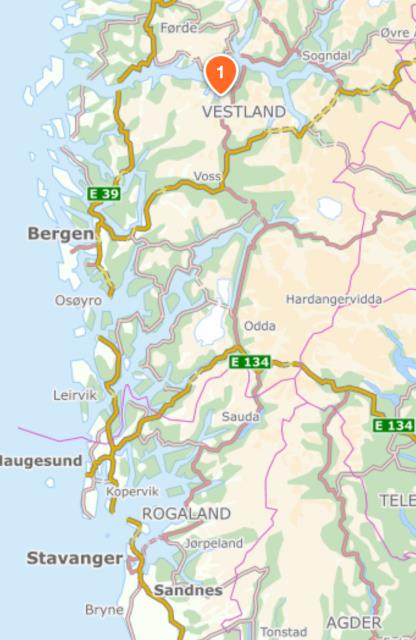 На картах отмечено расположение по отношению к местному фьорду и в масштабах западной Норвегии: