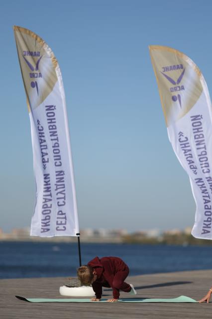 Старший внук в тот же день занимался акробатикой, тоже у воды. Упражнение на фото издевательски называется ;"курочка", потому что устоять в такой позе очень сложно, клюешь носом)