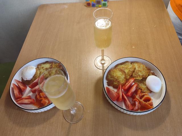 Без драников и без шампанского - отличный завтрак:)Вместо драников кусок белого хлеба и масло, а вместо шампанского - кофе. :)