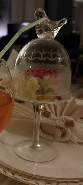 Да, очень элегантно всё было подано) С ананасом была копчёная курица и овощи (разные, я уже точно не помню сочетания в разных рецептах, хотя я все перепробовала). Самым необычным для меня салатом была «Красная шапочка» на следующем фото, под ‘птичкой’. С лосятиной (вместо говядины) и гранатовыми зёрнами))