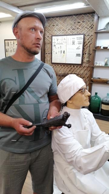 Фото мужчины с чугунным крокодилом в руках рядом с восковым доктором - очень классное, художественное и выражение лица там очень типичное для мужчины рядом с доктором: