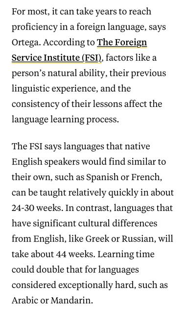 А ещё зависит от того, какой язык. Вот тот же Чешский или Хорватский я уже через пару недель плотного общения начинаю понимать где-то на 1/3. А китайский, его учишь-учишь, и все равно непонятно, потому что в другом тоне уже другое слово получается. От языка очень много зависит