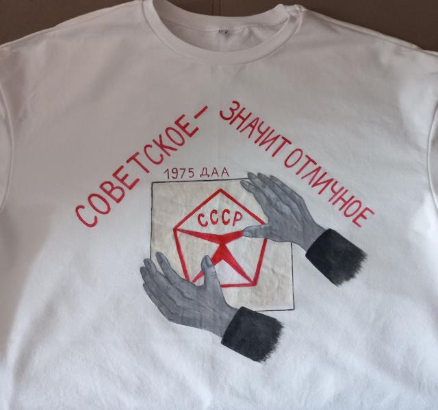 Моя художница вся в учебе, но дяде (брату моему) на 50 лет сделала подарок в жанре советского плаката) Он оценил, сказал на работу будет носить))