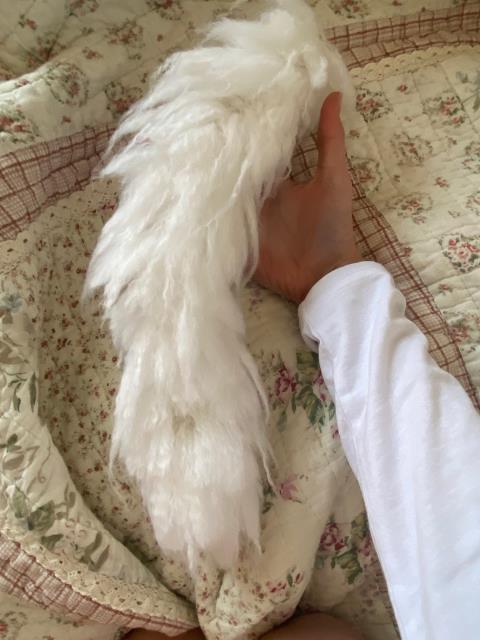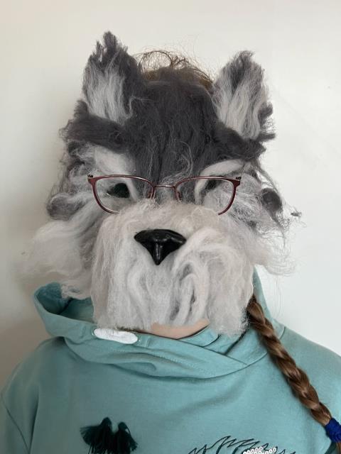 Хвост она делала из ниток, расчёсывала их специальной щёткой. А в маске основа картонная, сама склеила нос, форму и на неё приклеила овечью шерсть. Нос слепила и покрасила. Получился волк в овечьей шубе)))